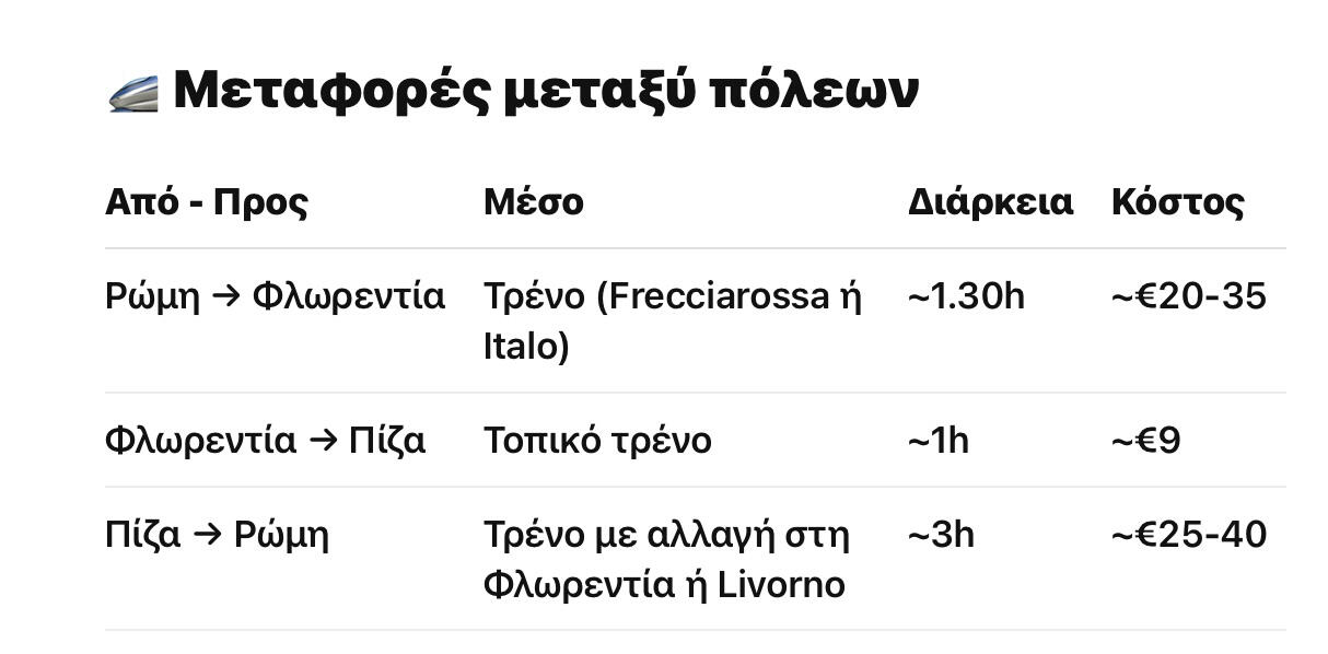 • Ενοικίαση αυτοκινήτου για μεγαλύτερες αποστάσεις.⸻🚗 Πώς να πας από πόλη σε πόλη